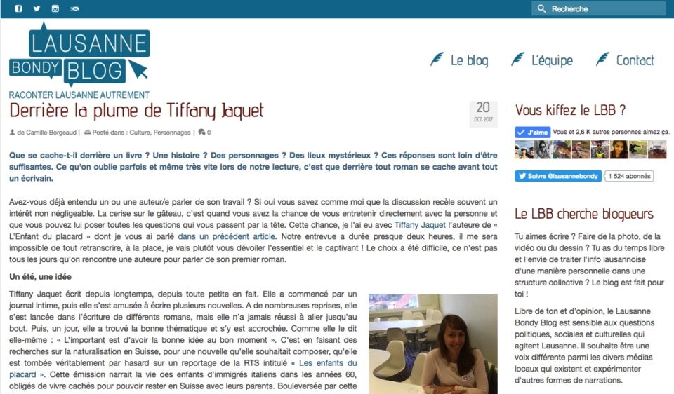 Le Lausanne Bondy Blog écrit sur notre auteur, Tiffany Jaquet