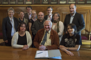 L’Etat de Vaud et la ville de Lausanne signent des conventions avec 3 editeurs vaudois. mardi 19 avril 2016. Isabelle Cardis Isely, editions Plaisir de lire, Michel Moret, editions de l’Aire, Andonia Dimitrijevic Borel, editions l’Age dhomme, assis ARC Jean-Bernard Sieber