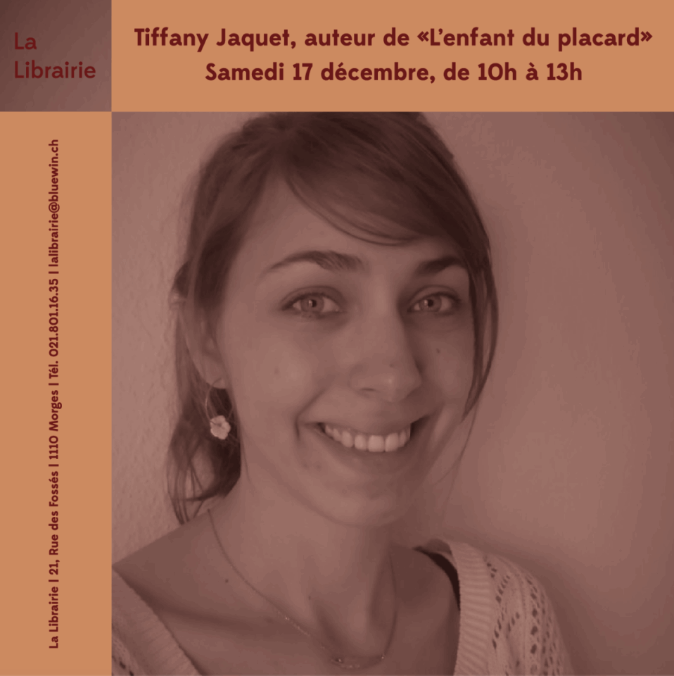 Tiffany Jaquet dédicacera son premier roman, L’Enfant du Placard, samedi 17 décembre entre 10h et 13h à La Libraire (Rue des Fossés 21), à Morges, aux côtés de Janine Massard, Anne-Sophie Subilia et Lolvé Tillmans. Vous pouvez également découvrir une interview de l’auteure sur le magazine en ligne Assu’mag, en cliquant ici…