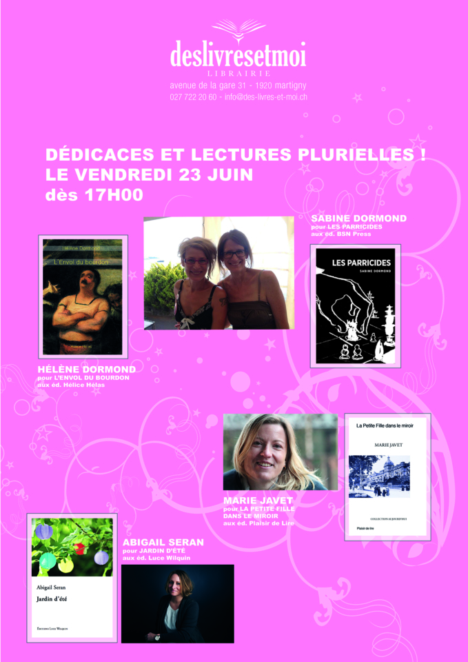 Marie Javet dédicacera La Petite Fille dans le miroir aux côtés de Abigail Seran (Jardin d’été, Luce Wilquin), Hélène Dormond (L’Envol du bourdon, Hélice Hélas), et Sabine Dormond (Les parricides, BSN Press) à la librairie Des Livres et Moi de Martigny le samedi 23 juin dès 17h. Si vous êtes en Valais, n’hésitez pas à […]