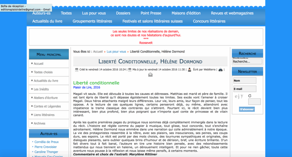 Sur le site d’actualité littéraire romande et francophone Weblittera.ch, une chronique de Liberté conditionnelle, premier roman d’Hélène Dormond: Hélène Dormond nous emmène dans une narration qui colle admirablement à notre époque. La vie des protagonistes ressemble à la nôtre, avec ses plaisirs, ses insouciances, ses peines, ses coups durs, ses espoirs. Le récit est porté […]
